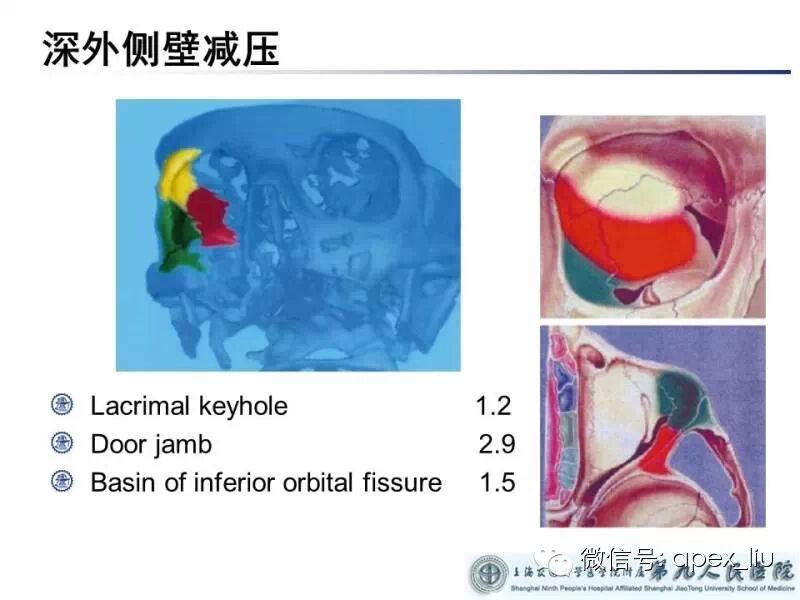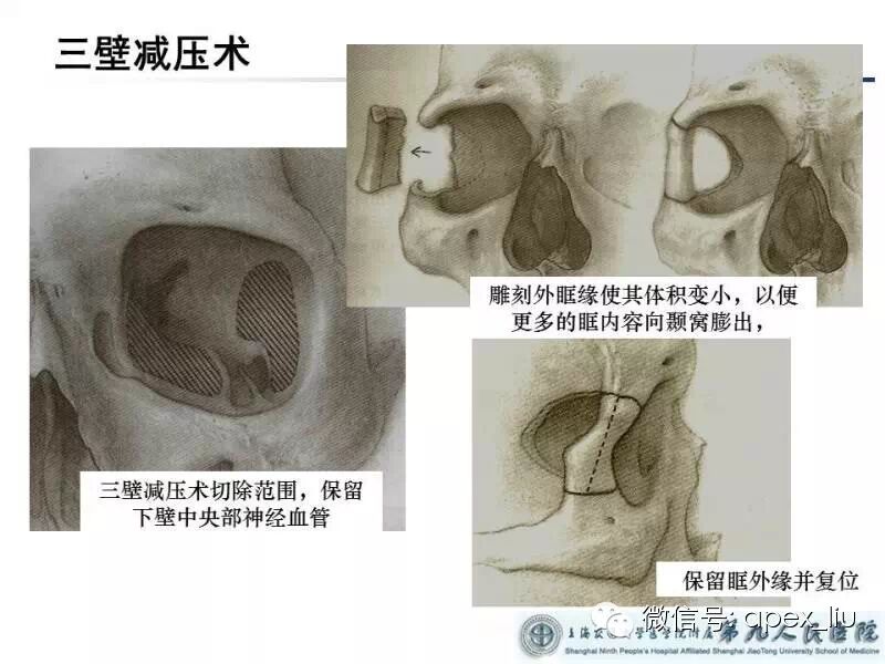 三壁减压包括内侧壁、底壁和外侧壁的减压。对于眶外侧缘的处理:通常先将其截骨后进行充分外侧壁减压,之后将眶外侧缘磨小后固定回眶缘,对于眼球突出严重的患,可不保留外侧缘。