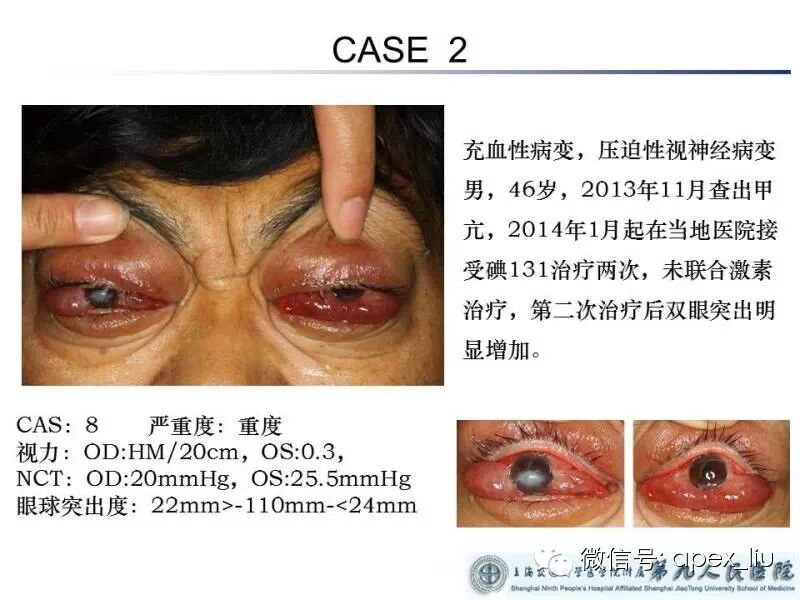 这是另一例TAO患者,病史如下,患者双侧眼睑结膜充血性病变、压迫性视神经病变,CAS评分8分,眼球突出度分别为右眼22mm,左眼24mm。