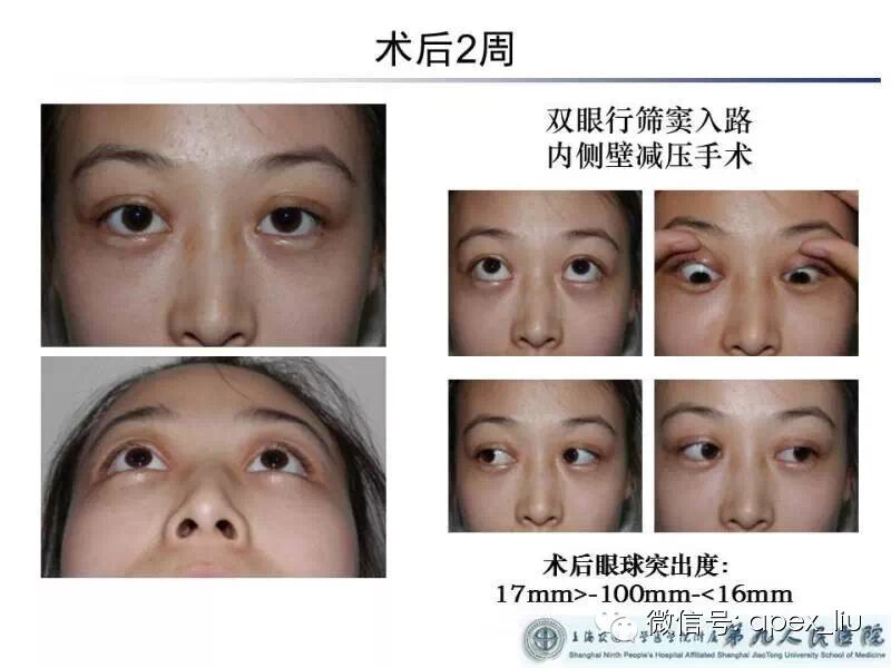 我们为她进行双眼的经窦内侧壁减压术。这是她术后两周的样子。