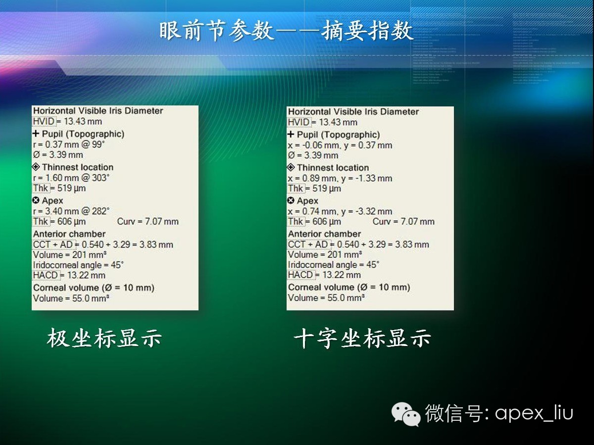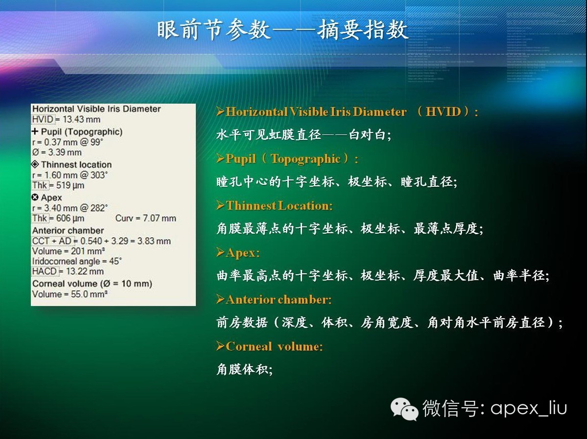 前房数据(深度、体积、房角宽度、角对角水平前房直径);