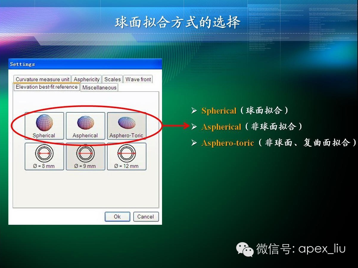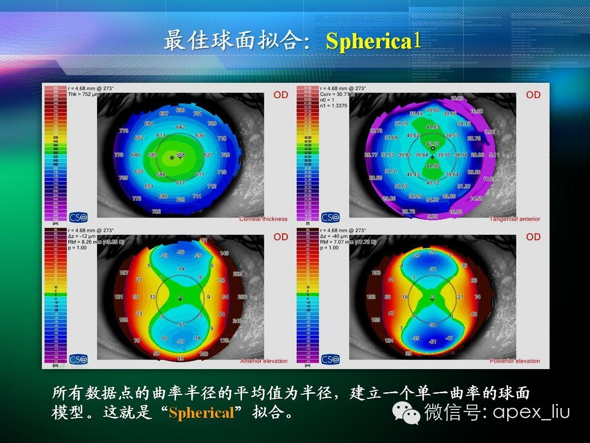 普通球面、大散光的球面、不规则的球面,分别用不同方式的球面拟合方式,以真实再现角膜的高度状态。