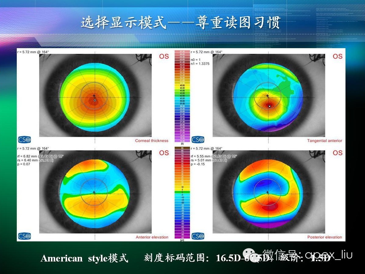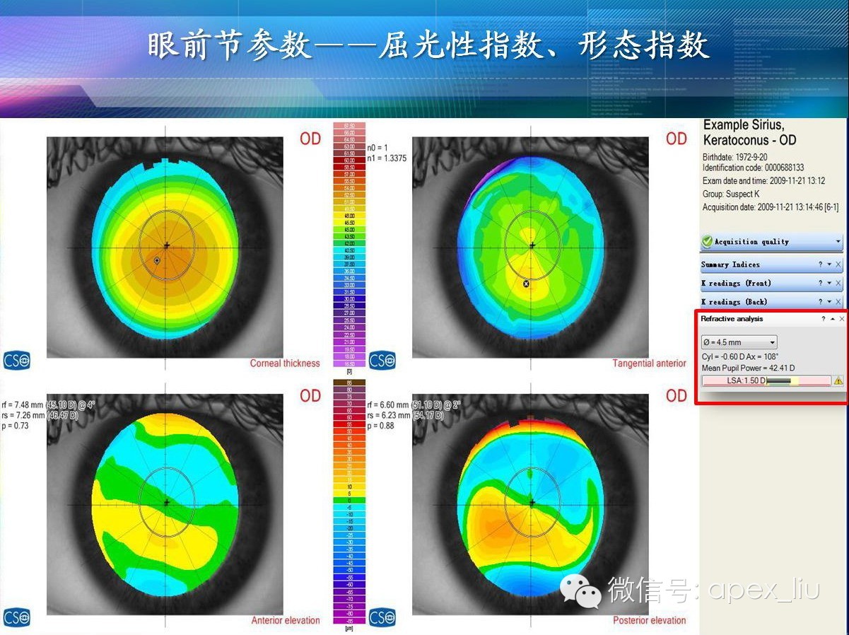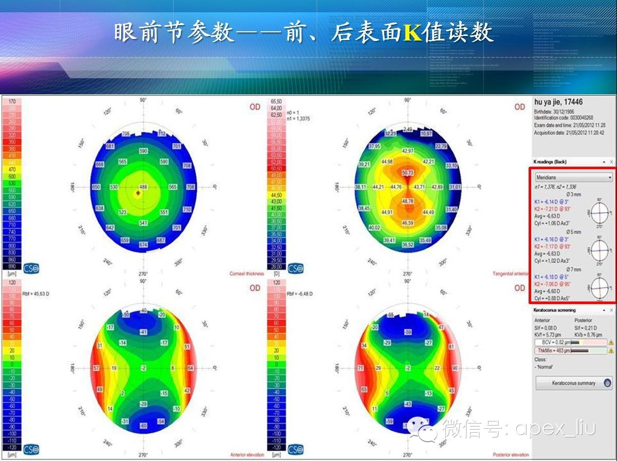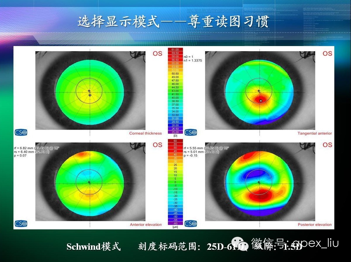 这里需要注意的是:可能基于参考球面的高度数据,显示角膜的高度并无异常,但是其参考球面的屈光力如果已经在50D以上,也要考虑后表面前凸的风险。